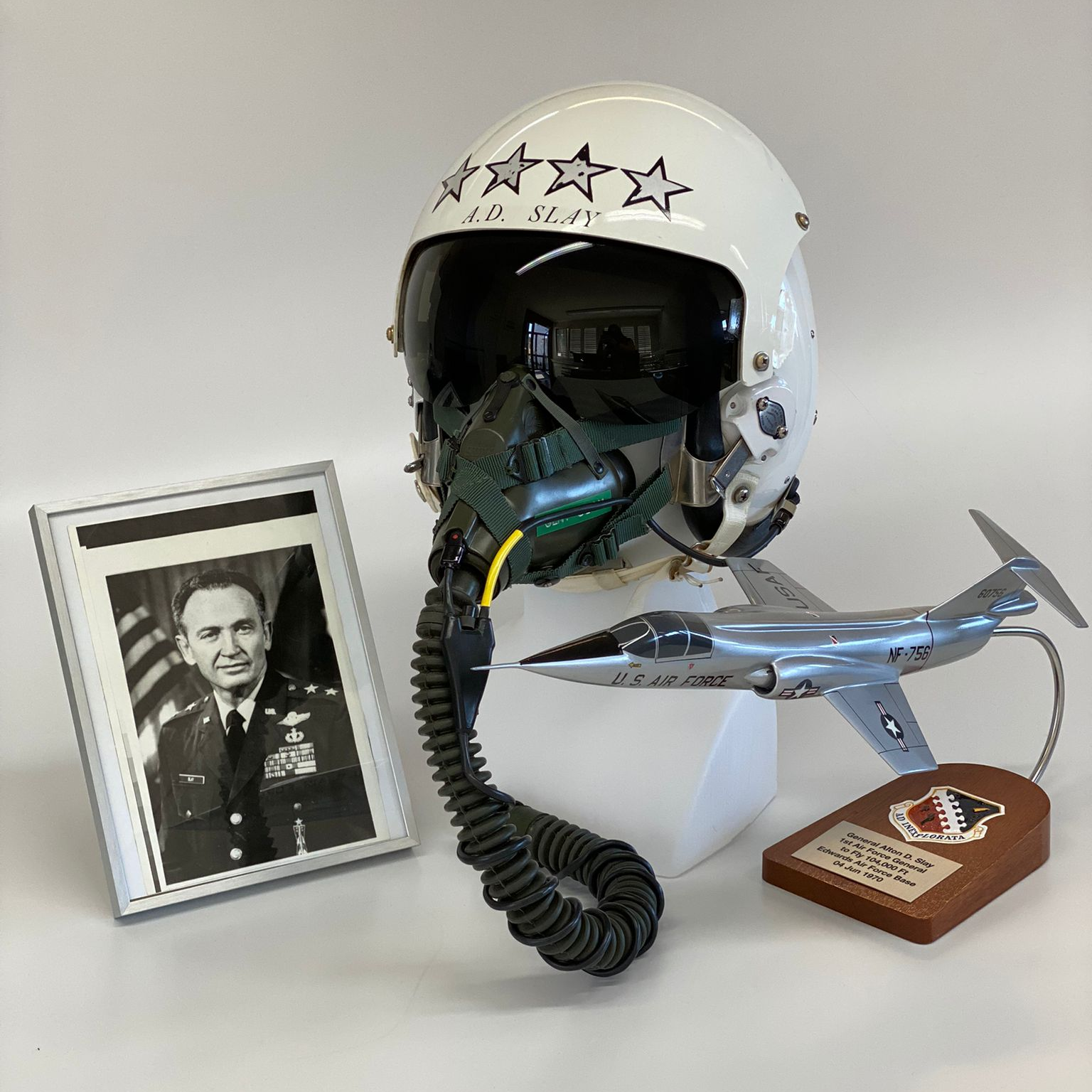 Es zeigt den Fliegerhelm und die an General Slay verliehene Auszeichnung für eine erreichte Flughöhe von 104.000 Fuß (31.700 m) in einer Lockheed F-104 mit zusätzlichem Raketenantrieb.